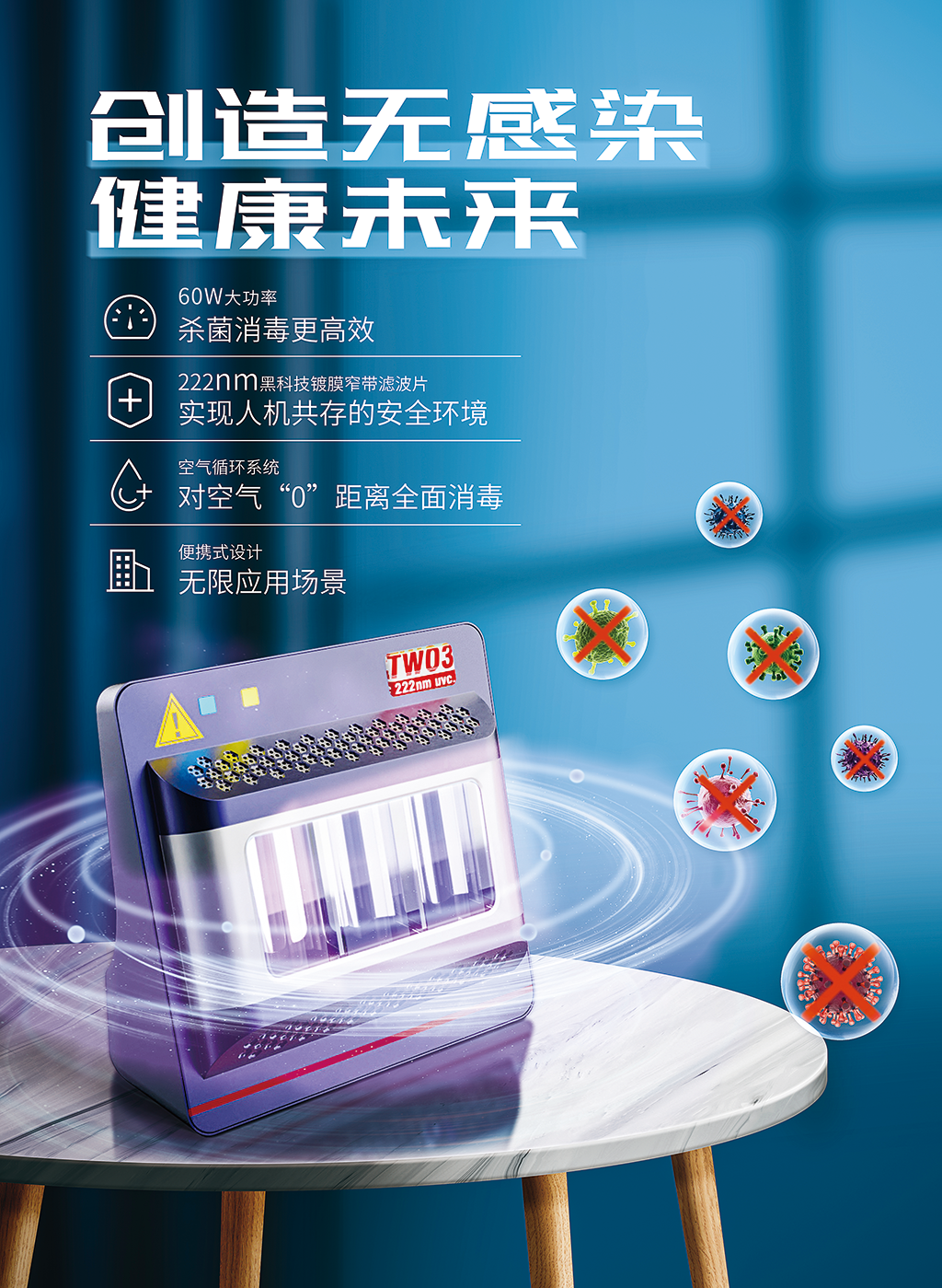 Two3紫外线消毒仪具有安全的特点。222nm远紫外线可以杀死细菌、真菌、病毒等,而对人体皮肤组织无明显伤害。